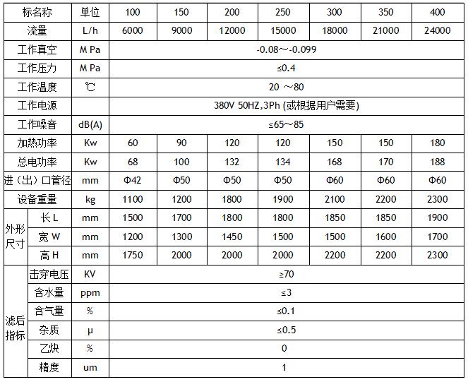 立式雙級(jí)絕緣油真空凈油機(jī)(進(jìn)口品牌泵)參數(shù):
