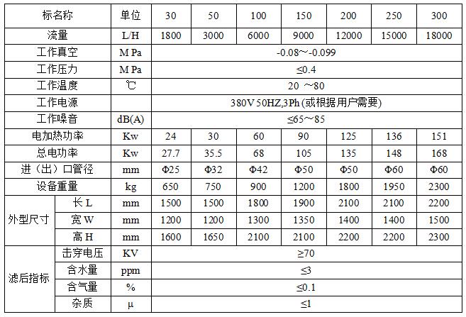 Z系列變壓器油高效真空濾油機技術(shù)參數(shù):